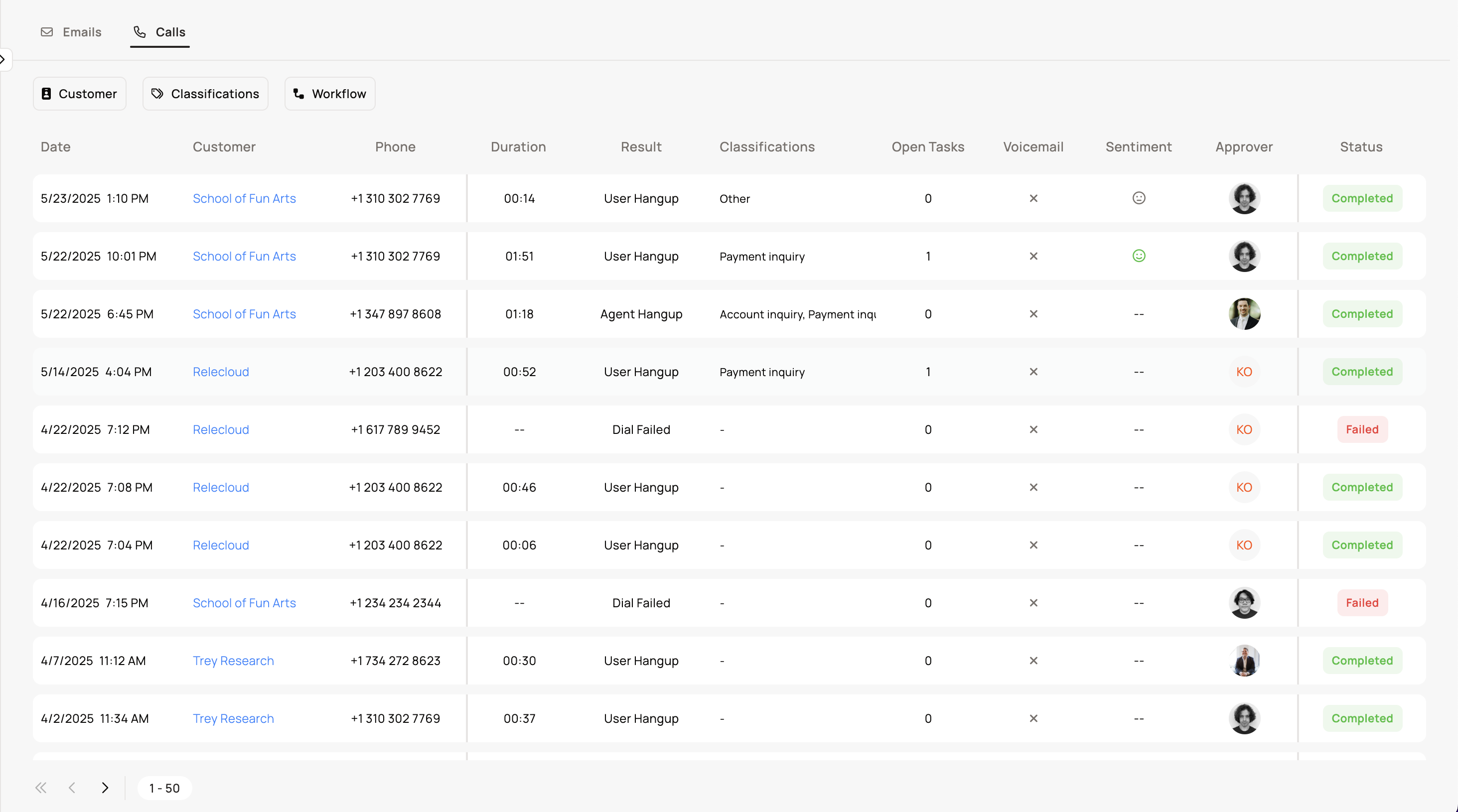 We've added more details to the calls page as well as the ability to filter by customer, classifications, and workflows.