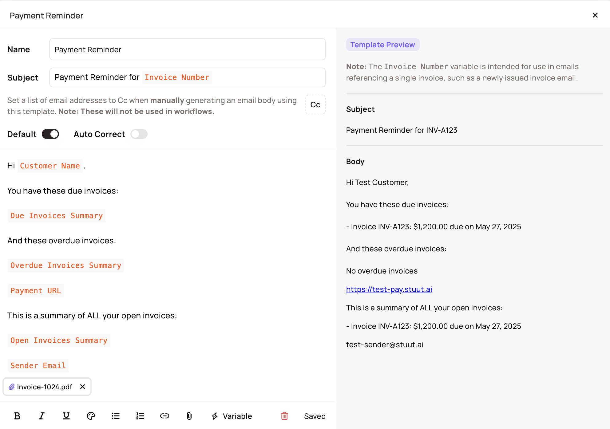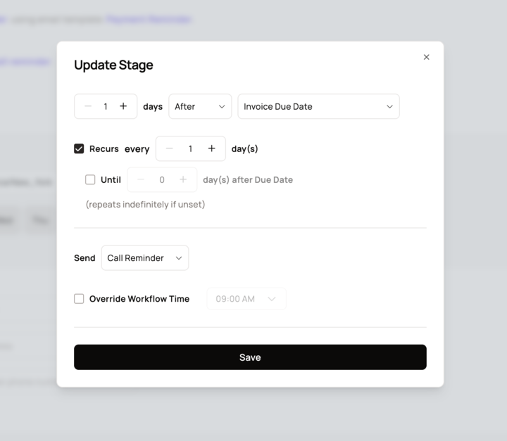 You can now set up your outreach workflows to automatically repeat specific stages. For example, you can configure a reminder to be sent every 7 days. You also have the option to set an end point for these recurrences, such as "until 15 days after the invoice due date."